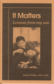 It Matters: Lessons from my son is a collection of poems and prose written by Janice Fialka, a social worker and mother of two children, one of whom has developmental disabilities. Her writings honestly describe the range of feelings and experiences of being a parent of a child with special needs. She writes about inclusion, use of labels, the power of support groups, and talking to siblings about special needs. She also includes suggestions for professionals. It Matters: Lessons from my son is full of honest emotions and insights for both parents and professionals.